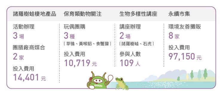 環境友善農業所付出的高成本反映於產品價格上,上銀科技舉辦永續市集、團購活動,以購買行動分攤農友保育環境與生物所付出的成本,並媒合團體膳食供應商一同響應;與林業保育署推出的「山林製造」森林消費品牌合作,藉由保育類動物玩偶的可愛設計吸引大人小孩目光,呈現物種特徵,並提供親子認識台灣物種的機會及關注,消費同時回饋山林;投入資源辦理生物多樣性講座,提升上銀員工及親屬對於生物多樣性的認知,期許透過支持友善棲地標章農產品等永續消費模式,以達成促進淺山動物之里山棲地保育行動。