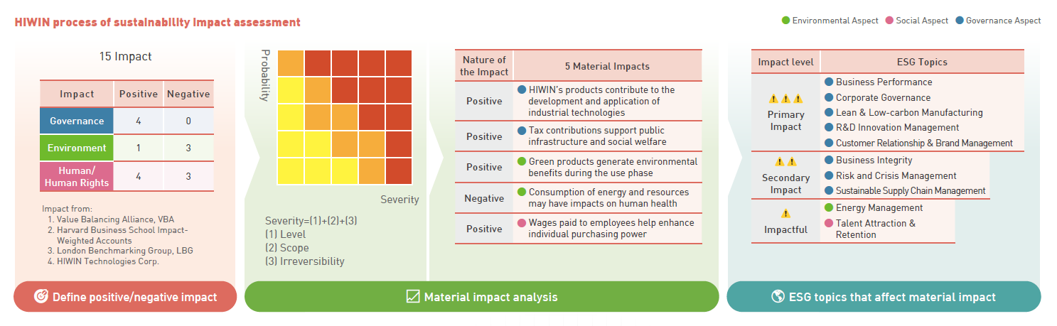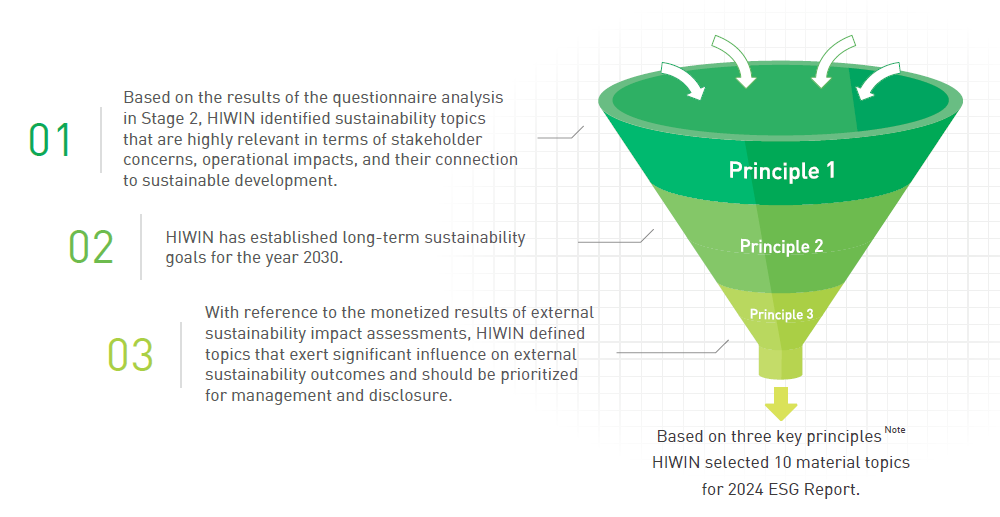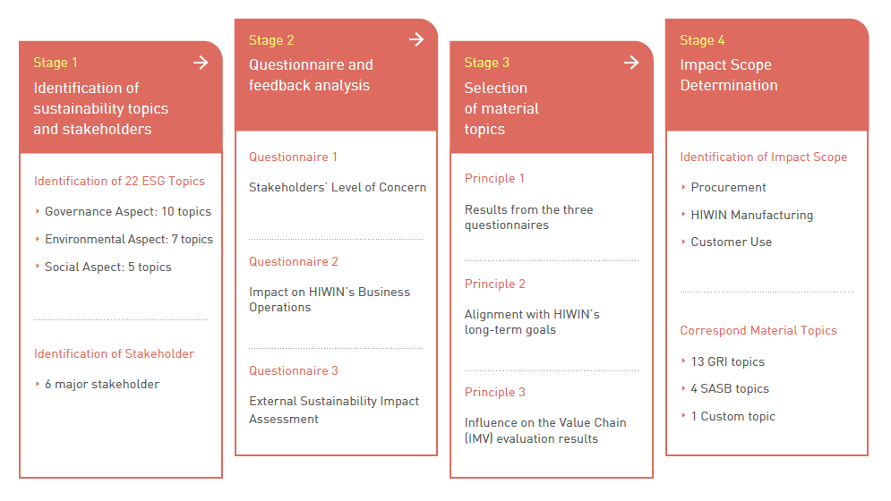 HIWIN conducted a materiality assessment in accordance with the GRI Sustainability Reporting Standards and the AA1000 Accountability Principles (AA1000 AP). A four-step analysis process was established to identify material topics for the 2024 Sustainability Report and determine the boundaries for sustainability disclosures. This process also integrates internal resource allocation and serves as a basis for formulating long-term sustainability goals.