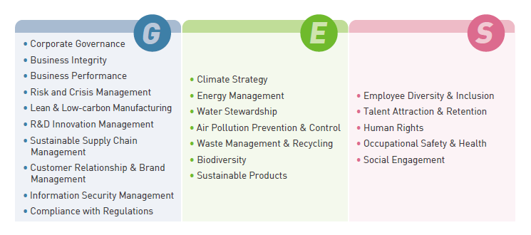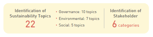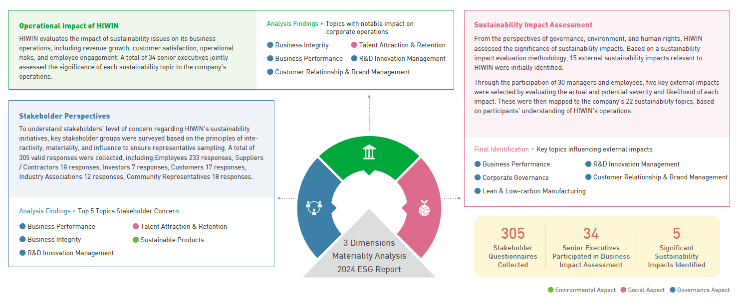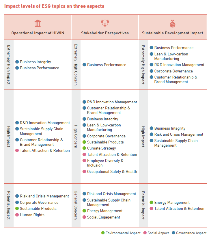 In response to the revised GRI 2021 Universal Standards, HIWIN identified 22 sustainability topics relevant to its business operations. This process also considered the United Nations Sustainable Development Goals (SDGs), international trends, ESG evaluation criteria from global investors, and recommendations from both internal and external consultants. Based on discussions with internal teams and external consultants, the list of topics was refined as shown in the figure below. The finalized list of sustainability topics was reviewed and approved by the President and subsequently incorporated into three stakeholder questionnaires.