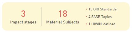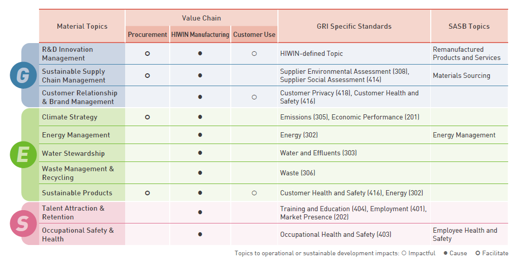After identifying 10 material topics, HIWIN followed the GRI Standards to determine 18 material topics relevant to the company (including 13 GRI Standards, 4 SASB Standards, and 1 HIWIN-defined topic). In accordance with reporting requirements, HIWIN collected and disclosed internal information, data, and management approaches. Each material topic was then reviewed to determine its impact scope, covering the upstream procurement stage, HIWIN manufacturing processes, downstream customer use.