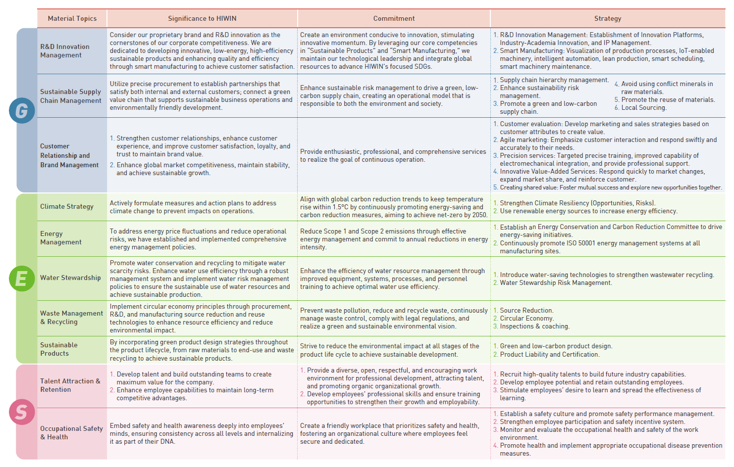 To strengthen senior management’s commitment and accountability for sustainability issues, HIWIN links material topics to the performance evaluations of senior executives by incorporating specific sustainability targets into the performance assessment system. This approach drives the implementation and continuous improvement of material topics.