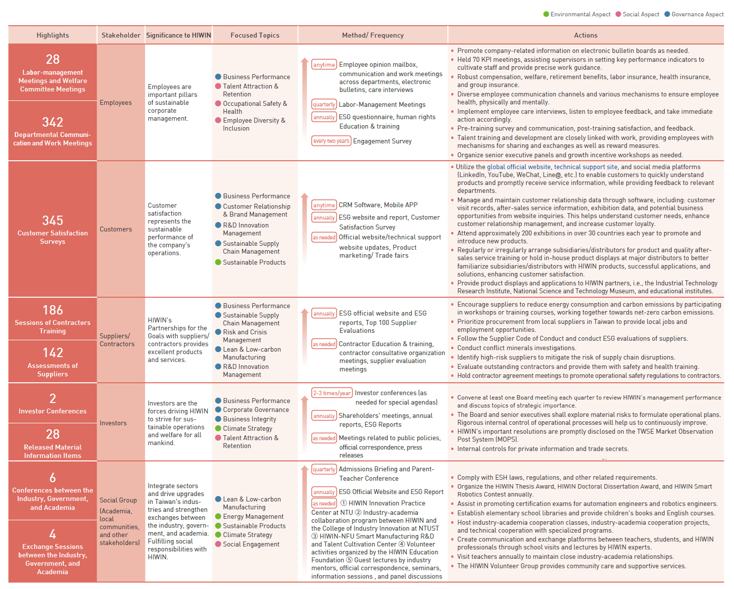 HIWIN identified its sustainability report’s stakeholder groups based on the five core principles of the AA1000 Stakeholder Engagement Standards (SES): Dependency, Responsibility, Tension, Influence, and Diverse Perspectives. Through this process, HIWIN identified 6 key stakeholder groups: employees, customers, suppliers/contractors, investors, industry associations, and community organizations.