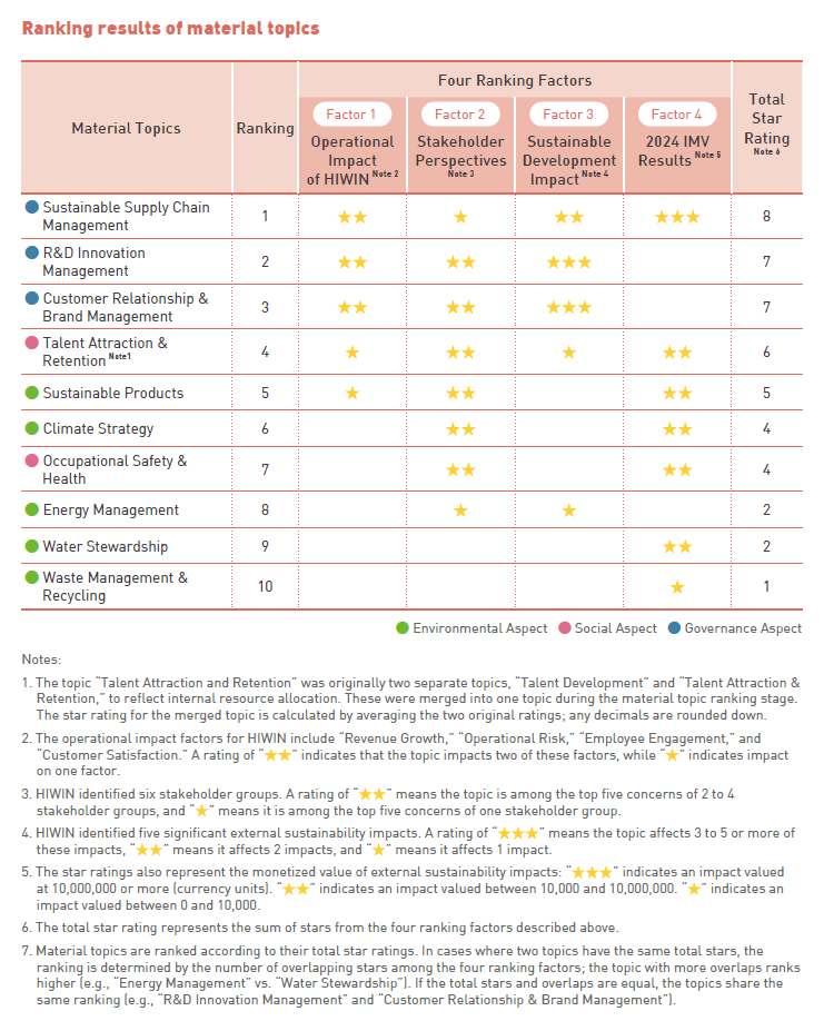 A multi-dimensional approach was adopted to define material topics. Topics that met at least two of the three key principles were prioritized for inclusion in the material topic list. Based on the recommendations and discussions with internal and external experts, HIWIN ultimately identified 10 material topics. Each topic was evaluated against the three principles, and scored using a star rating system derived from the results of the stakeholder questionnaires and the 2024 impact assessment. The top 10 material topics were then ranked accordingly, as shown in the table below.