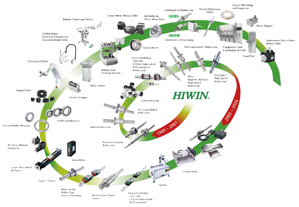 HIWIN is specialized in developing and manufacturing key components for linear motion products. HIWIN’s main products include ballscrews, linear guideways, industrial robots, wafer robots, torque motor rotary tables, bearings, strain wave gear, and medical robots. These products are primarily used in industries such as machine tools, industrial machinery, automation, semiconductor, optoelectronics, LED, new energy, 3C electronics, and medical equipment. Established in 1989, HIWIN has consistently invested in innovation, including production development, manufacturing processes, equipment, production capacities, sales channels, services, and talent cultivation. HIWIN expects itself to be a global leading brand in motion control and system technology.