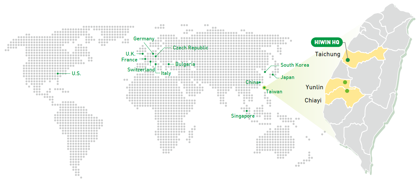 HIWIN Headquarters is located in Taichung, Taiwan, with service locations, subsidiaries, sub-subsidiaries, and R&D centers in major industrial countries, including the U.S., Germany, Japan, Italy, Switzerland, South Korea, Singapore, China, the Czech Republic, France, the U.K., and Bulgaria, totalling 12 countries. We also have over 300 sales and distribution networks worldwide to be closer to customers and provide better services.