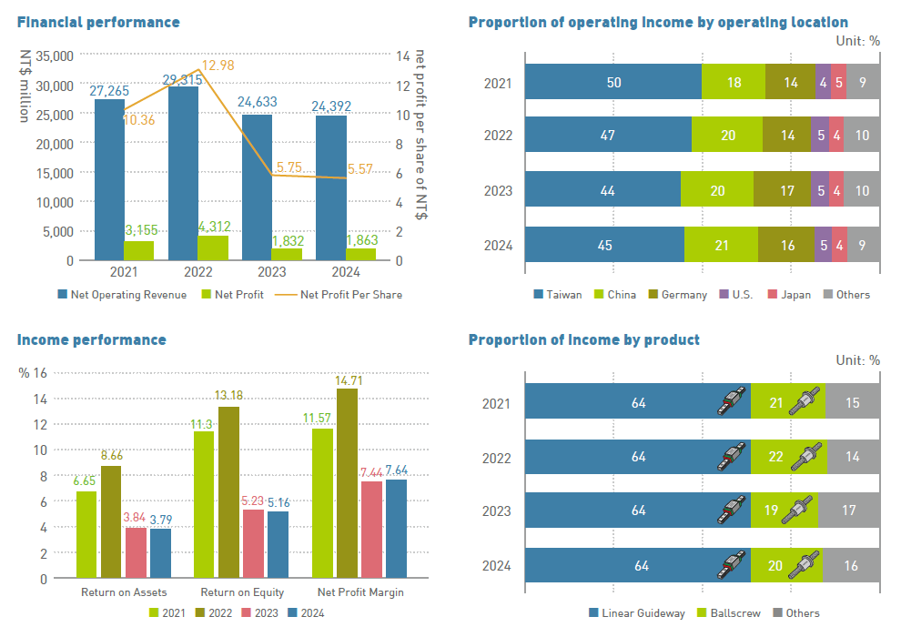 In 2024, global geopolitical tensions, ongoing trade protectionism, and continued weakness in the Eurozone manufacturing sector resulted in a subdued recovery momentum for the global economy. The average global Manufacturing Purchasing Managers’ Index (PMI) stood at only 49.3%, reflecting the sluggish pace of recovery. HIWIN reported consolidated revenue of NT$24.392 billion for the year, representing a slight decline of 0.98% compared to 2023. All figures presented are based on the consolidated financial statements. For detailed financial performance, please refer to the HIWIN 2024 Annual Report.