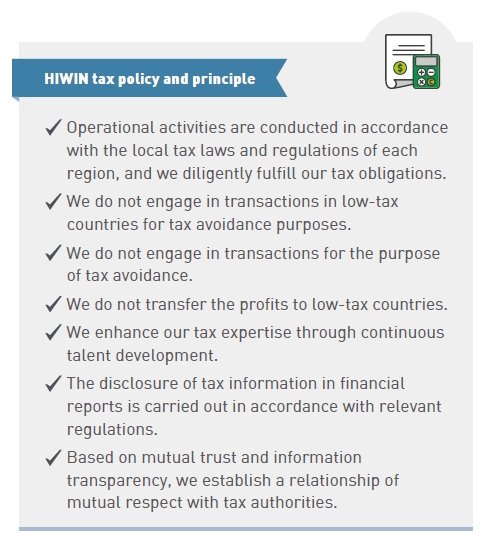As a responsible global corporate citizen, HIWIN upholds the value of innovation and sustainable operation, committing to information transparency and sustainable development. We fulfill our social responsibilities in the regions where we operate, assume reasonable tax burdens in major operating countries, support government tax incentive policies, and contribute to local economic development and industrial innovation. We manage and formulate HIWIN’s tax policies and guidelines to pursue sustainable development based on sound and reasonable principles.