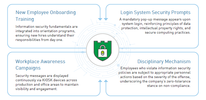 Recognizing that human behavior is a critical component of cybersecurity, HIWIN implements a multi-tiered training and awareness program to cultivate a strong securityconscious organizational culture. These initiatives aim to instill secure practices among all system users and equip technical personnel with advanced skills. Key Initiatives to Strengthen Security Awareness: