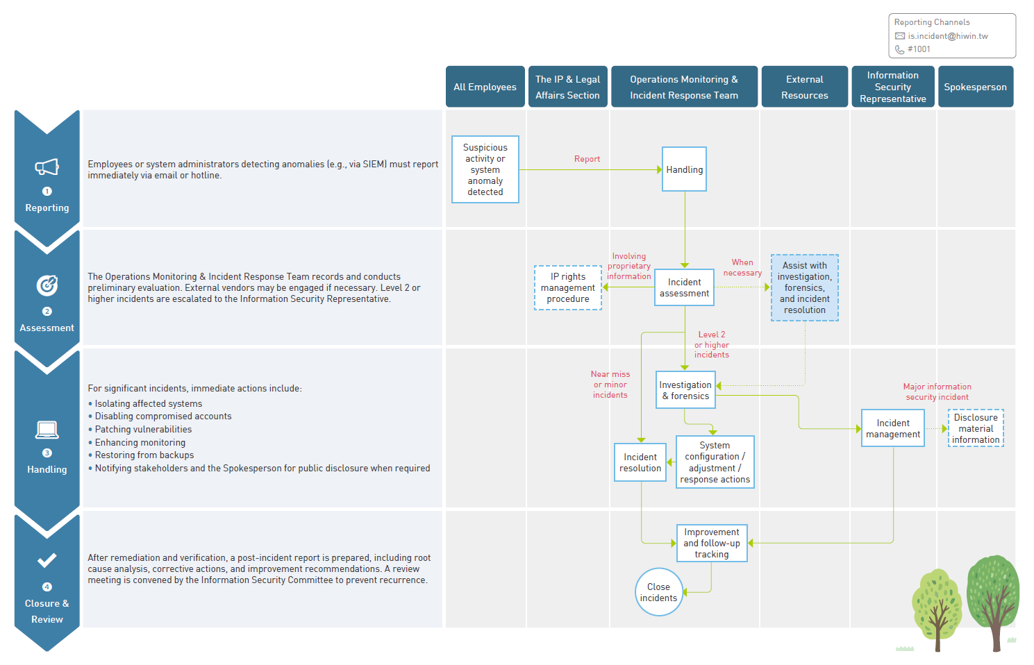 To ensure prompt detection, assessment, and resolution of potential security incidents, HIWIN has established a formal Incident Reporting and Response Framework. All employees and system administrators are required to report suspicious activities immediately.