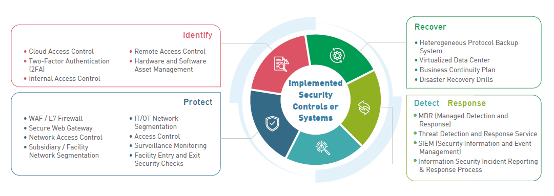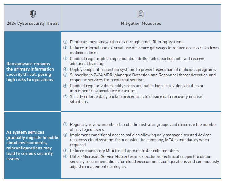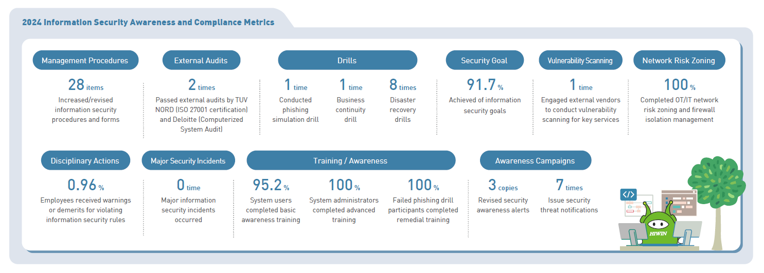 At the governance level, HIWIN has established the Information Security Committee, chaired by a Board Member, the President, to oversee the implementation, effectiveness, and continuous improvement of the Information Security Management System (ISMS). The Information Security Representative submits an annual governance report to the Board of Directors, ensuring boardlevel oversight and accountability.