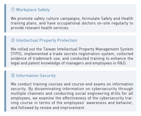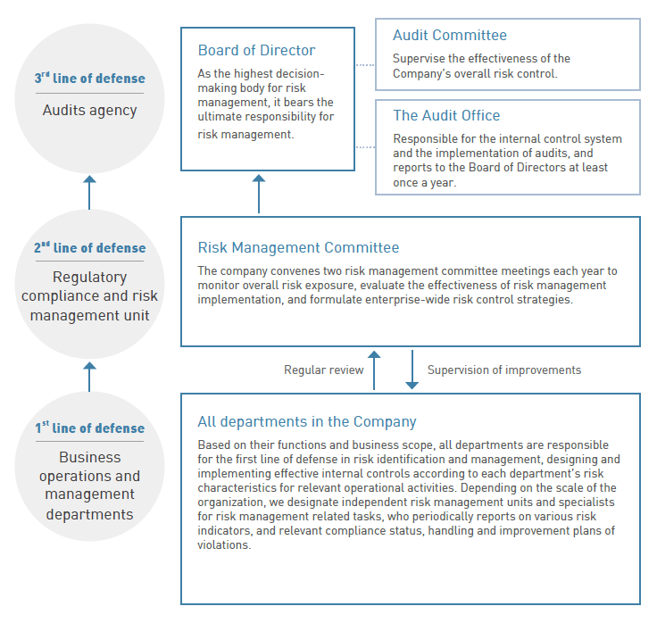 HIWIN has established Risk Management Committee responsible for risk control implementation. It adopts the Three Lines of defense mechanism of internal control to ensure the smooth operation of overall risk management.