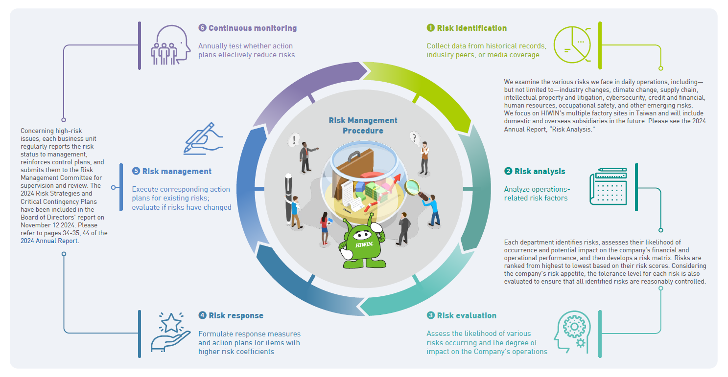 HIWIN established its risk management procedures based on the ISO 31000 framework, which the Board of Directors approved in 2020. We control risks relevant to business operations by following the tiered organization and internal control systems. We commit to evaluating critical global economic, social, environmental, and innovative technology risks by senior managers’ participation. We implement six cyclical processes: identification, analysis, evaluation, response, management,and continuous monitoring of risks that could threaten the Company’s future sustainable operation.