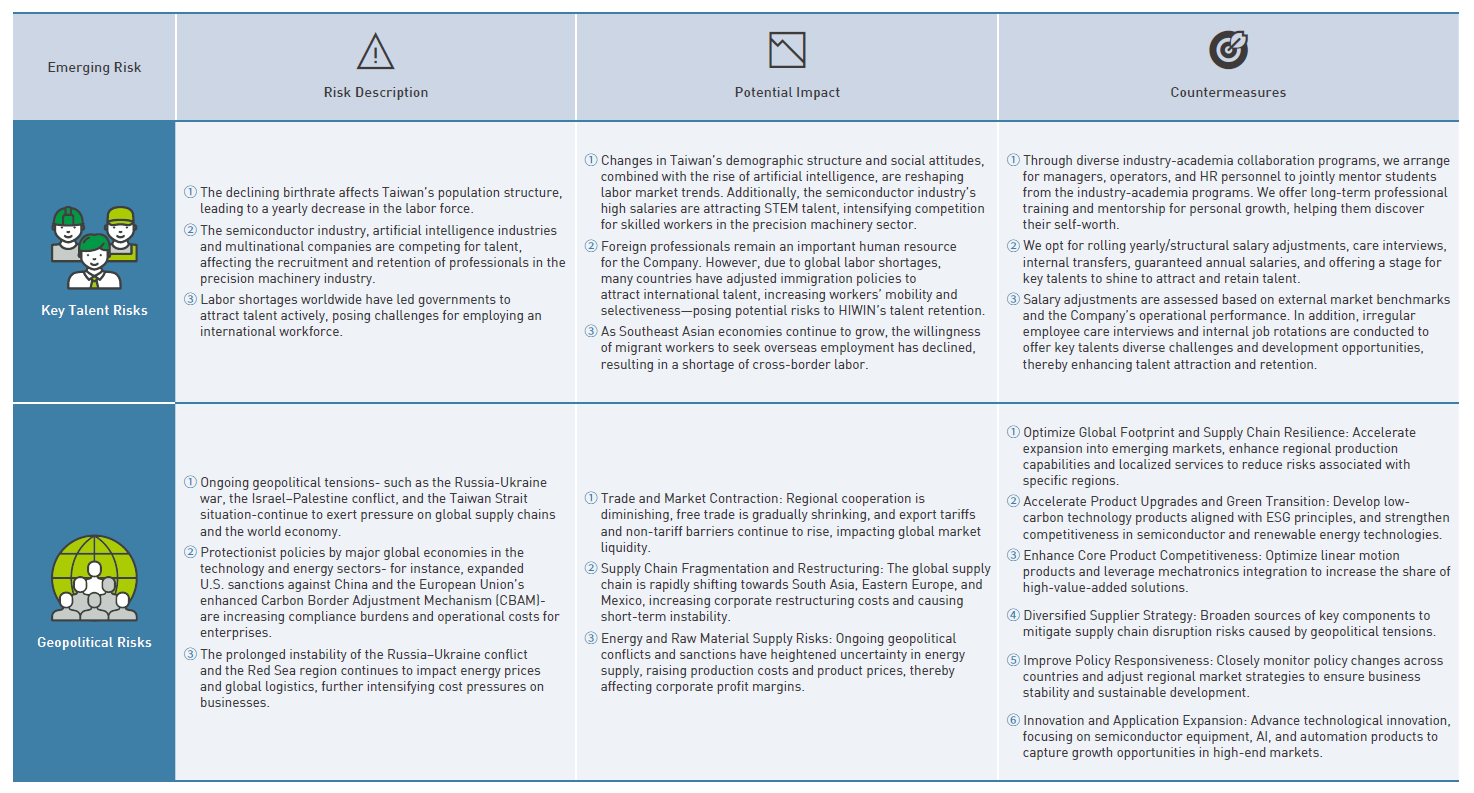 In order to address the emerging risks that result from ongoing changes in the global economy, society, and natural environment, HIWIN has implemented a mechanism for identifying these risks. This mechanism includes identifying emerging risks, assessing their impact, and developing measures to mitigate and manage these risks. The purpose of this mechanism is to effectively identify emerging risks and propose countermeasures to ensure sustainable operations.