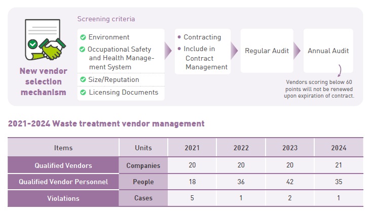 HIWIN’s operational waste has all been outsourced for disposal to government-approved vendors selected by the company’s Environmental Protection Department and Purchasing Department, based on six key screening criteria. After contract signing, these vendors handle outsourced waste collection, processing, and flow management. Only vendors scoring 60 points or above in the evaluation are included on the qualified vendor list. In 2024, HIWIN had a total of 21 qualified waste vendors, all rated as excellent in on-site evaluations.