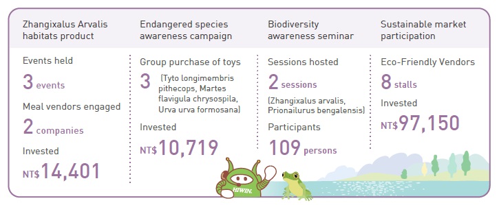 Environmentally friendly agriculture often comes with higher production costs, which are reflected in product prices. To support eco-conscious farming, HIWIN organized sustainable markets and bulk purchase activities, helping to offset the cost borne by farmers for environmental and biodiversity conservation. The company also partnered with the Forestry and Nature Conservation Agency’s “Forest Made” initiative—a forest-friendly consumer brand. Through the use of endearing endangered species plush toys, the initiative captures public attention, showcases the species’ unique features, and provides opportunities for families to learn about Taiwan’s native species while contributing to forest conservation through their purchases.