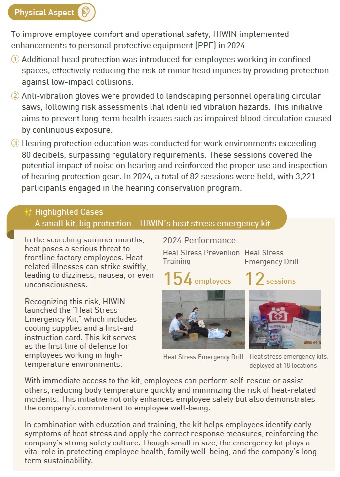 To prevent occupational injuries and diseases, HIWIN is targeting five hazards, related actions are as follows in 2024: