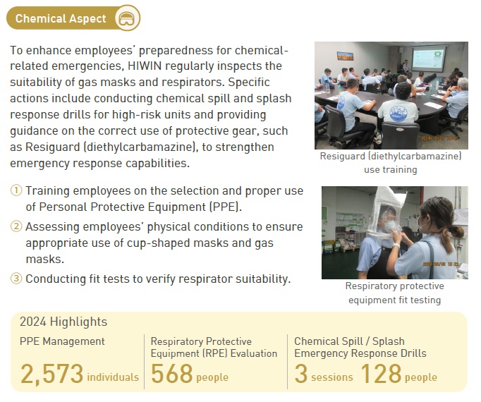 Hazardous chemicals used in various stages of each plant’s processes are stored in designated areas and managed accordingly. The storage locations and containers are labeled in accordance with the Hazardous Chemical Labeling and Communication Rules and the GHS (Globally Harmonized System of Classification and Labelling of Chemicals) Regulations. Safety Data Sheets (SDS) are also placed in visible areas for easy access by operating personnel, enabling them to review them at any time and implement relevant emergency response measures. We also developed Hazard Identification Cards (H-Cards) for chemicals used throughout factories to help identify the storage locations of chemicals, providing crucial information during disaster response and preventing further risks as emergency procedures are activated. HIWIN also adheres to the Implementation Measures for Occupational Work Environment Monitoring and contracts qualified agencies to conduct regular operational environment monitoring every six months. In 2024, the monitoring covered 65 items, including noise, CO2, dust, comprehensive temperature heat index, oil mist, xylene, and ethanol. A total of 1,970 monitoring points were inspected (covering both areas and personnel). Of these, 14 noise points, and 9 comprehensive temperature heat index points exceeded permissible standards, and improvements were made through engineering adjustments, administrative management, or the use of protective equipment.
