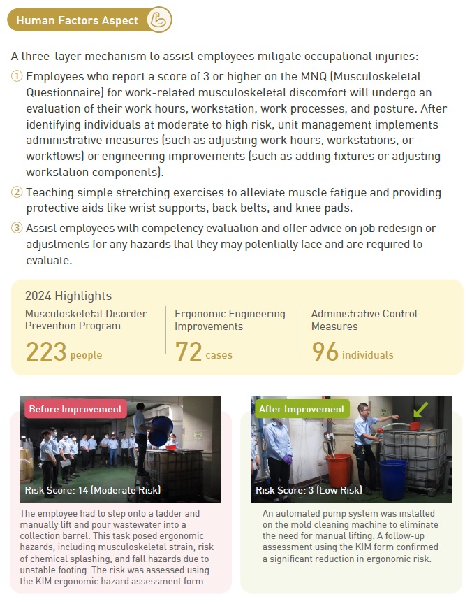 In 2024, each factory has completed various operational risk and opportunity assessments. The 20 operations with moderate risks listed as “unacceptable risks,” and risk control measures have been implemented. 20 of them have also been listed in the 2025 target management plan. For the highest proportion of “human hazards” operational risks, the main improvement measures are to replace improper actions and force with labor-saving tools and changes in related mechanisms.