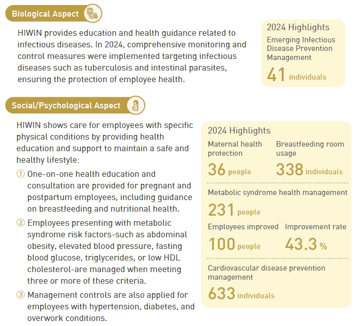 HIWIN implements a variety of health examination programs, including regular employee health checks and specialized assessments for tasks involving specific hazards, on an annual basis. In compliance with regulations, HIWIN organizes occupational health consultations and offers health education guidance through occupational health physicians and nurses.
