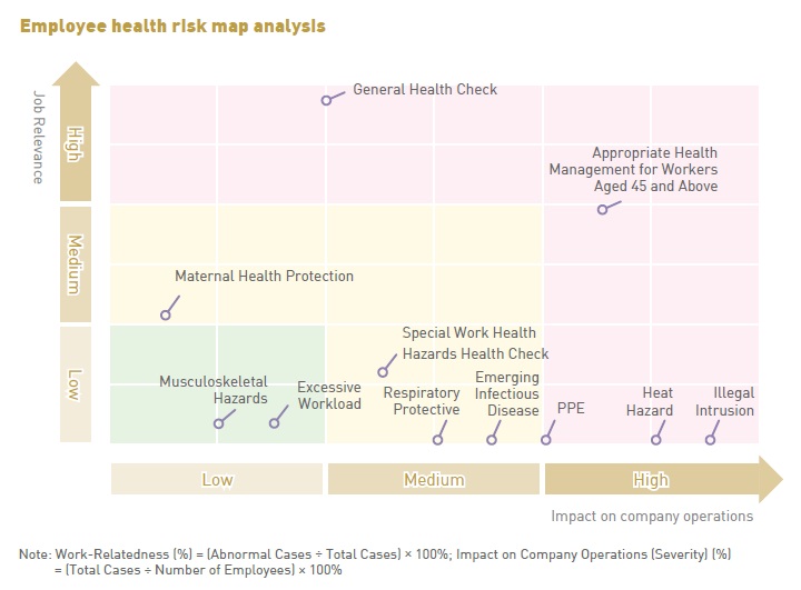 To effectively implement workplace health management, we prioritize specific groups. We accomplish this through the use of questionnaires or assessment analyses, considering the relevance to job responsibilities and the impact on company operations. Health Risk Assessment Map is as follows.