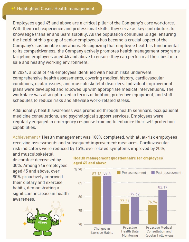 HIWIN employs a comprehensive management approach to employee care, focusing from three key perspectives: “Occupational Injury and Illness Prevention, Healthcare, and Health Promotion.” and five major steps: “Diagnosis, Plan, Implementation, Evaluation,” systematically manage employees of all categories and protect employee health.