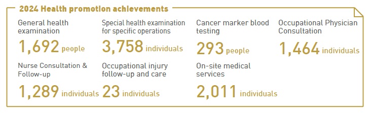 • Special health examinations are conducted for employees working in environments with health hazard factors (e.g., dust, specific chemical substances)  Completion rate: 100%