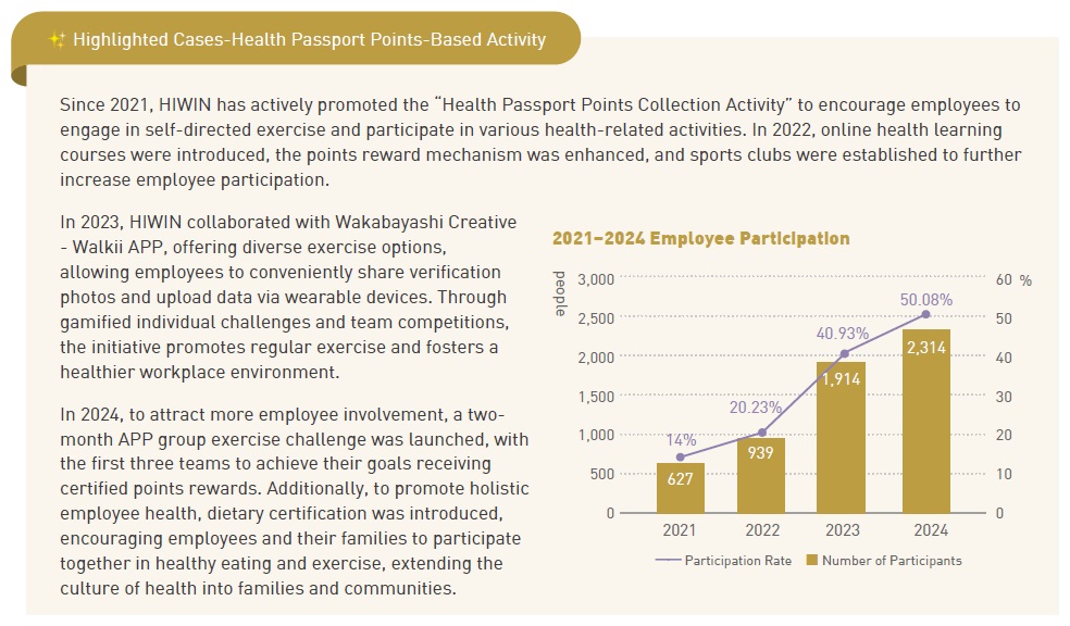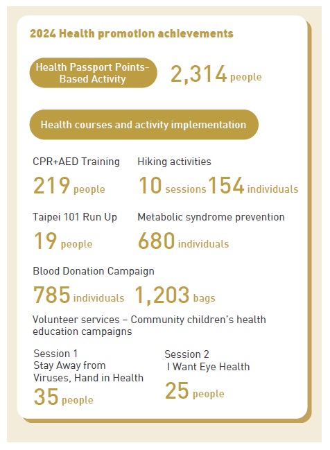 HIWIN prioritizes the overall growth of its employees, focusing on their physical and mental well-being. To accomplish this, HIWIN follows a thorough five-step health management approach. This approach encourages employees to adopt proactive health habits, improves their performance at work, and collaborates with them to create a workplace environment that promotes good health.
